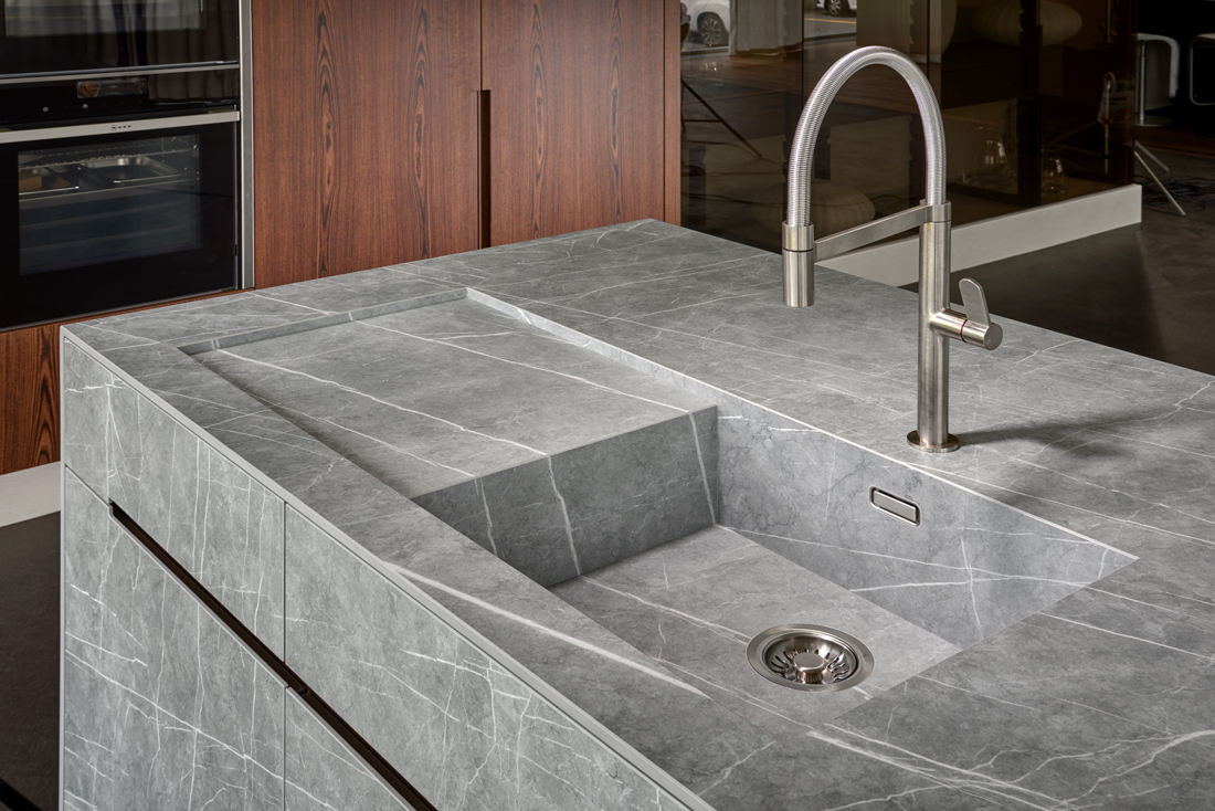La nova pedra de Neolith ha estat redissenyada per incorporar un to gris més ric, més industrial, amb venes blanques que realcen el fons en direccions contraposades. El model Zaha Stone, rendeix tribut a la recentment morta i increïblement talentosa, Zaha Hadid, una autèntica inspiració en la comunitat arquitectònica.
