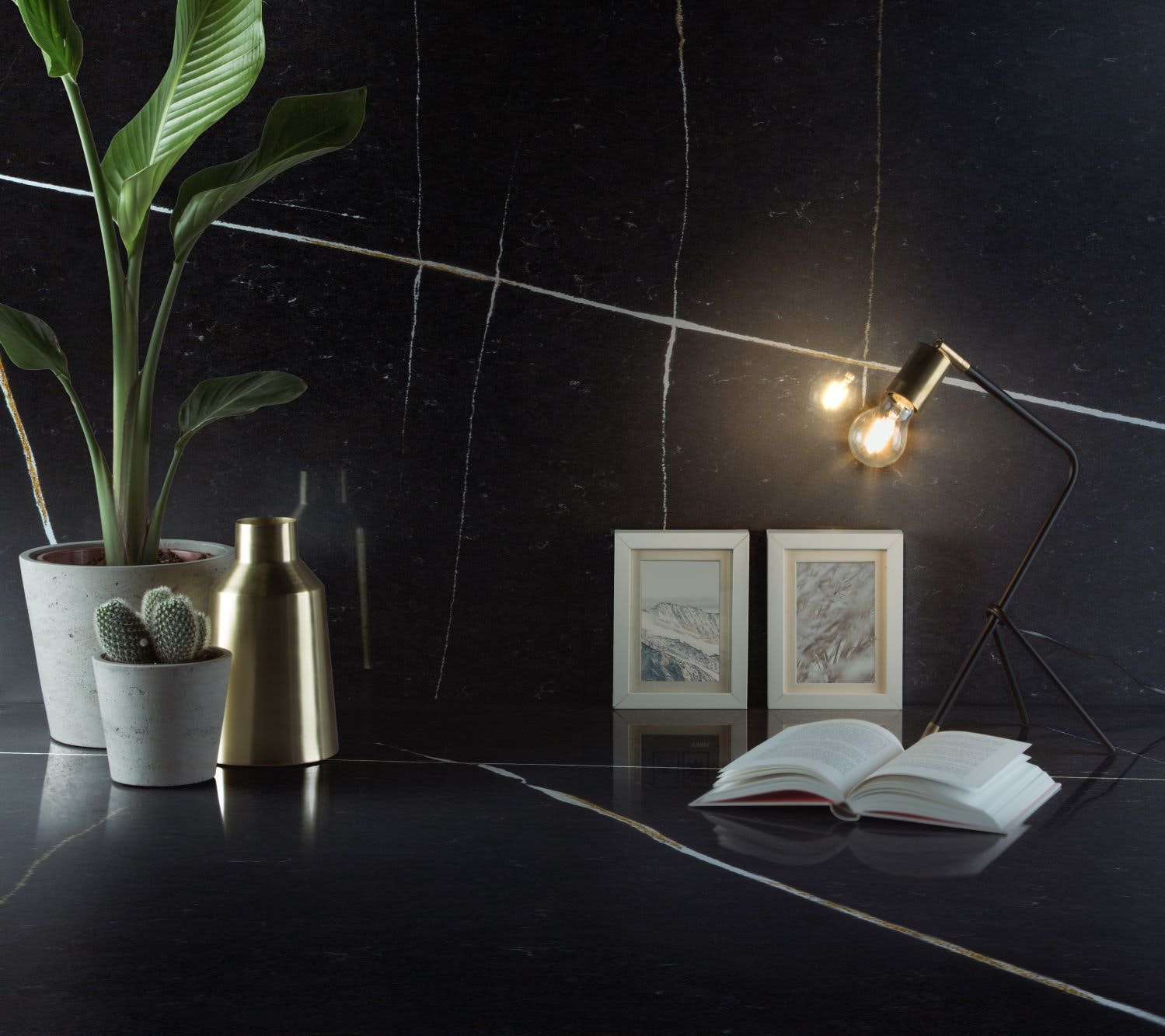 Eternal Noir ofereix un disseny inspirat en l'asimetria i en l'elegància plena de la pedra natural. El seu disseny avantguardista d'una nova estètica clàssica i fresca, i el seu exemple com a producte en el qual s'ha parat esment al detall. El seu acabat negre és sinònim de distinció i sobrietat, i les seves intenses i vertiginoses vetes, dominades per un destacat joc de tons blancs i taronges, sucumbeixen a tots els gustos estètics. Eternal Noir és un color que atrapa i que convida a apostar pels colors foscos en la decoració.