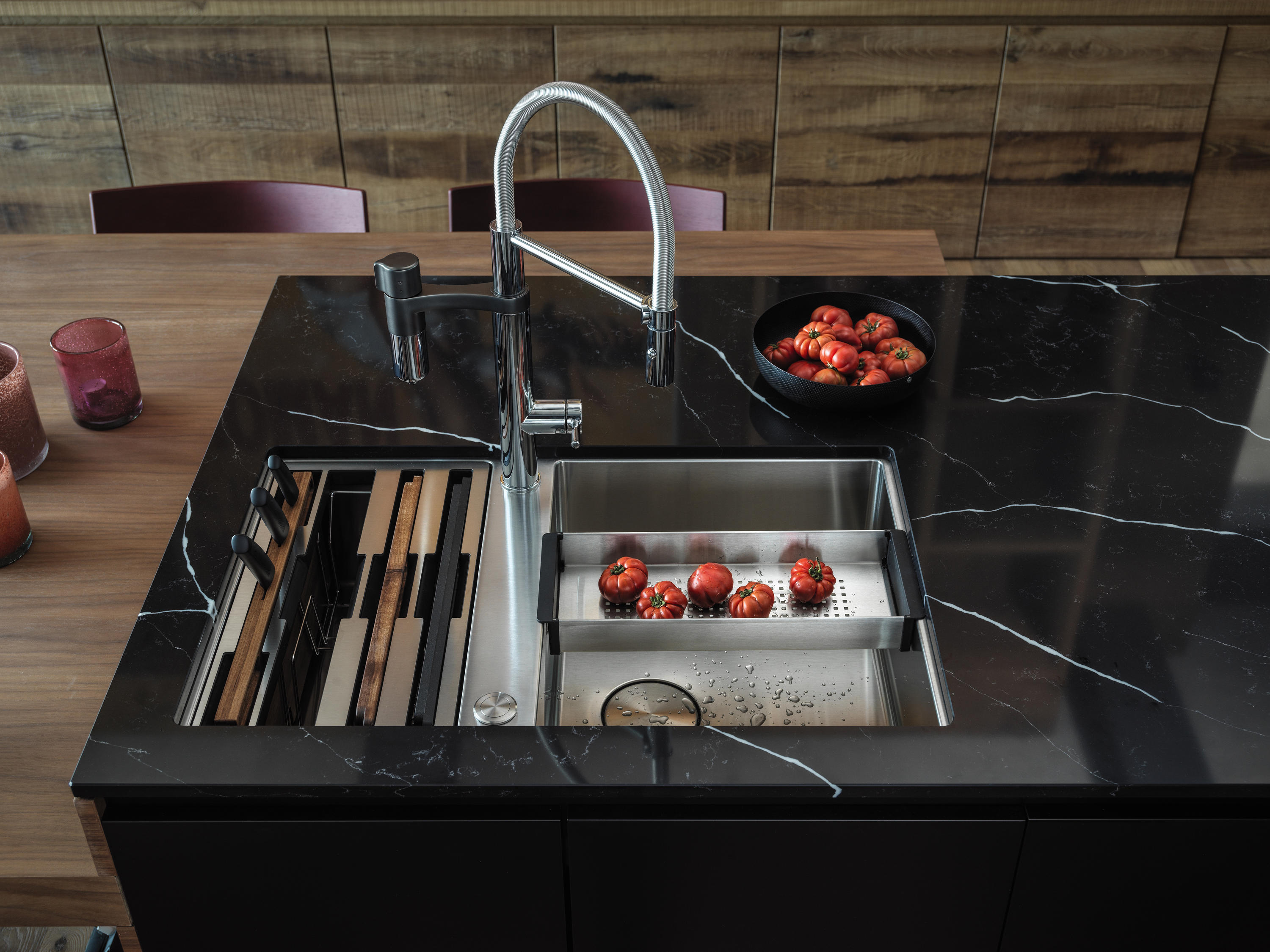 Multifuncionalitat, acompliment professional, gran atractiu tècnic-estètic. Box Center és un espai de treball que combina harmoniosament i dinàmicament l'àrea de rentada i l'àrea dedicada a la preparació d'aliments, garantint un flux de treball pràctic i fluid.