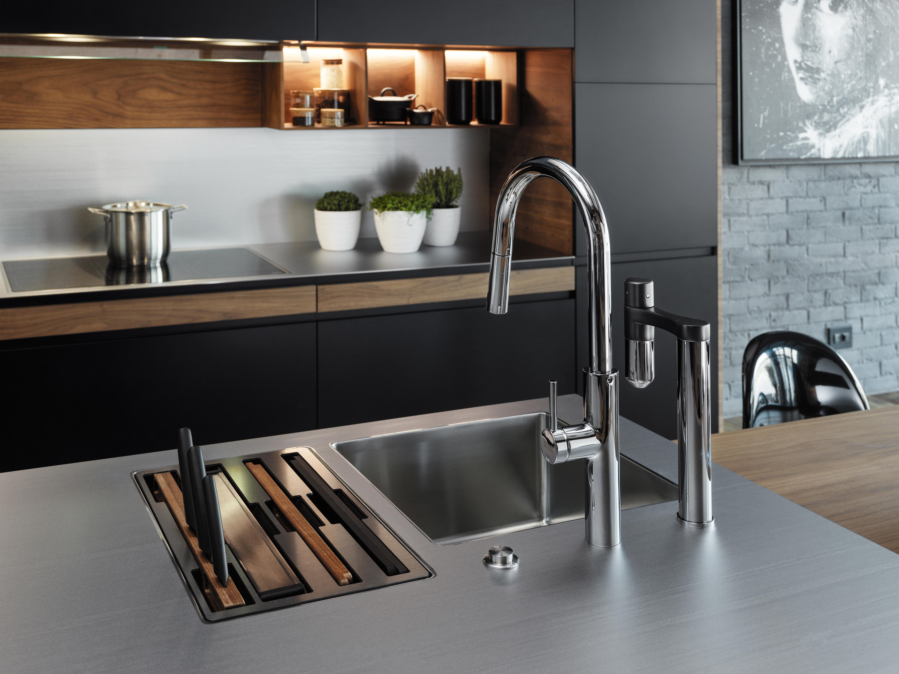 El Box Center és una solució de cuina intel·ligent i molt pràctica, amb un bonic i atractiu disseny. Les dues cubetes estan perfectament integrades i ofereixen una zona ideal per a guardar i assecar els accessoris de cuina. No es pot demanar més!