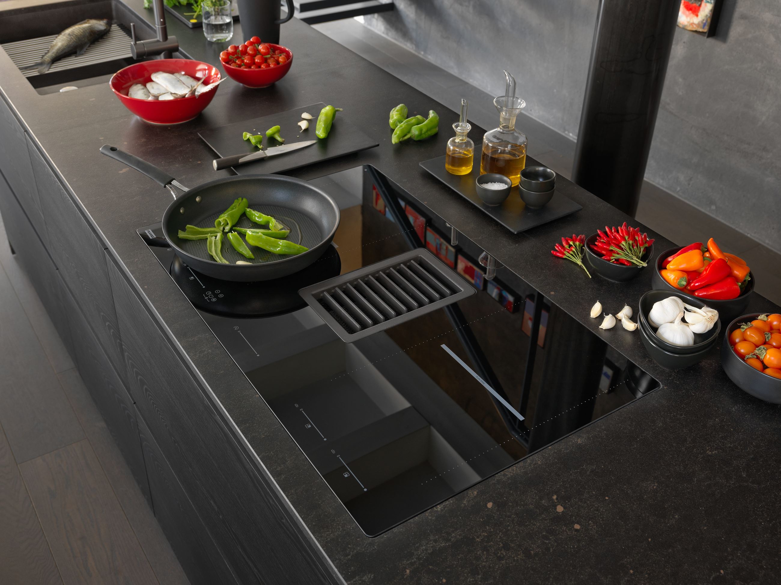 La revolució de l'àrea de cocció consisteix en una campana completament integrada en la placa de cocció, sistema 2 en 1 ideal per a cuines en illa o península.