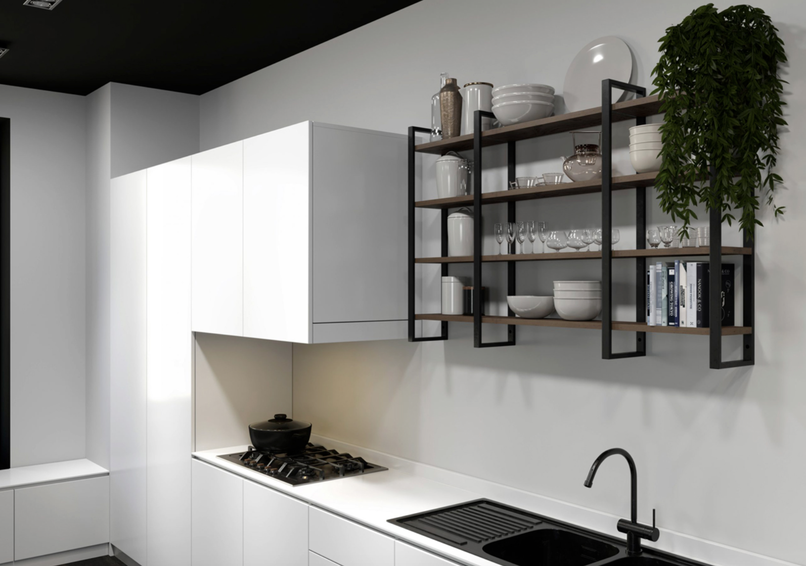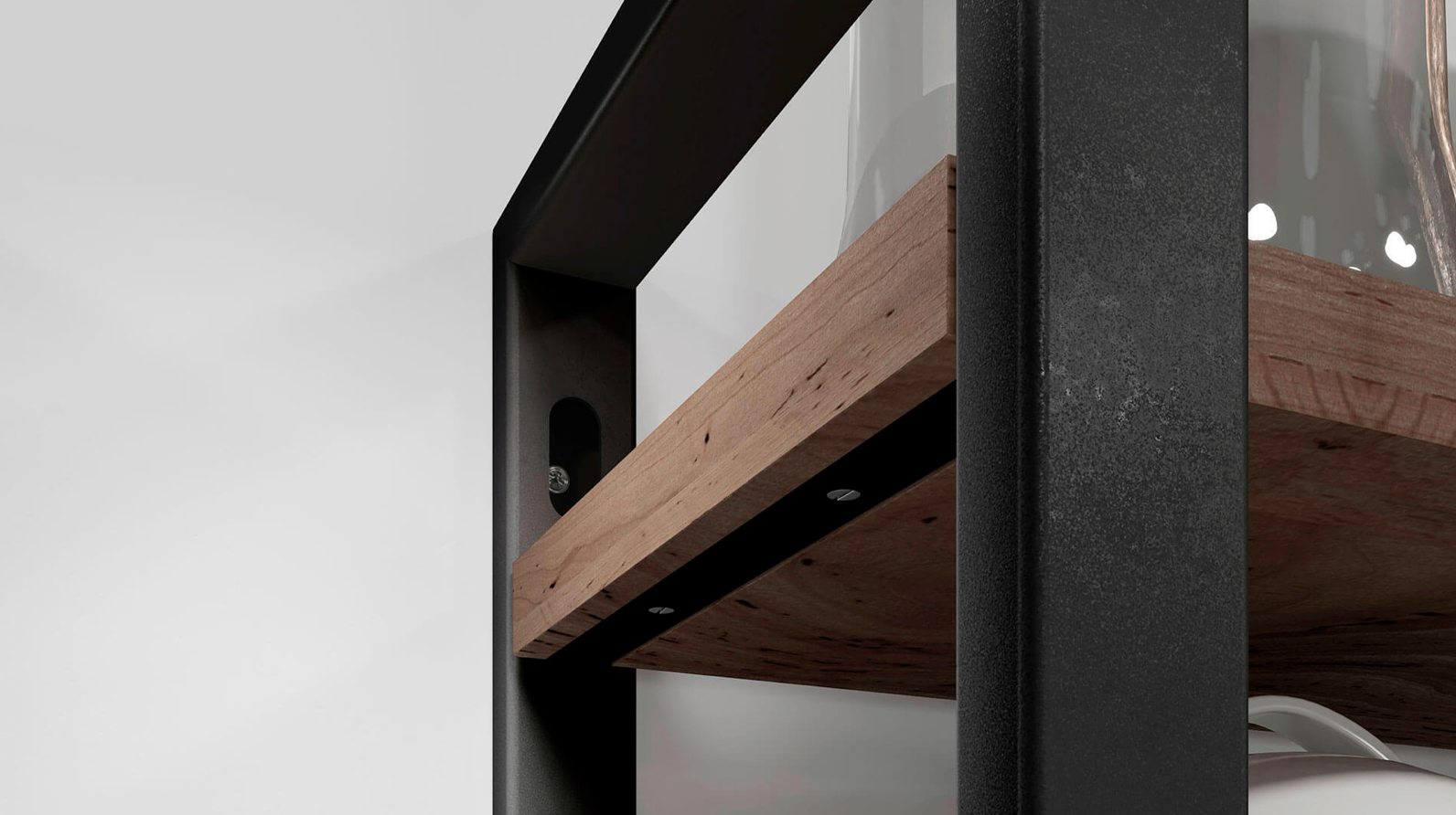 Aquesta prestatgeria modulable que combina el color negre sofisticat amb càlids prestatges de fusta uneix de manera elegant els espais de la teva casa, oferint possibilitats infinites a la decoració de la teva cuina, saló o menjador.