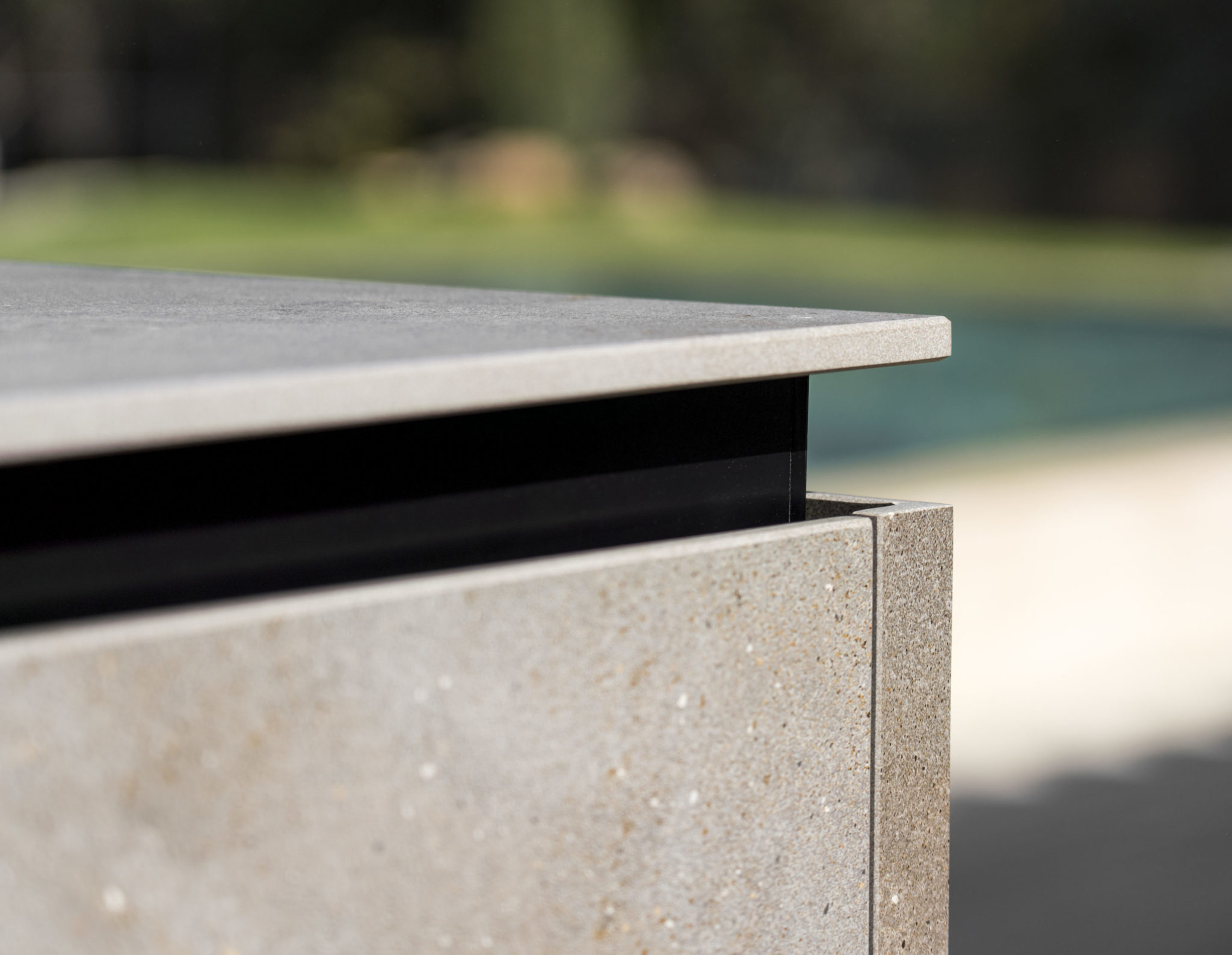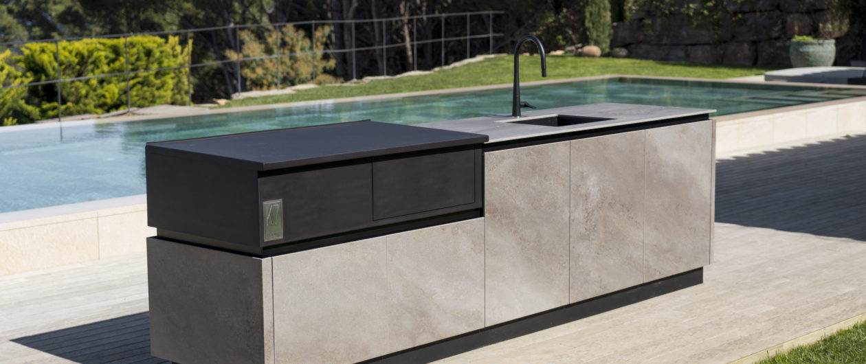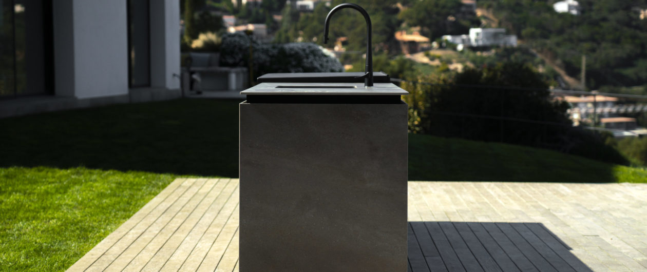 Aquest nou disseny de cuina exterior està basat en tres elements clau: porcellànic, alumini i foc. Totalment modular per blocs de 60 cm la cuina compta amb una pica integrat i una zona de focs que ofereix múltiples combinacions.