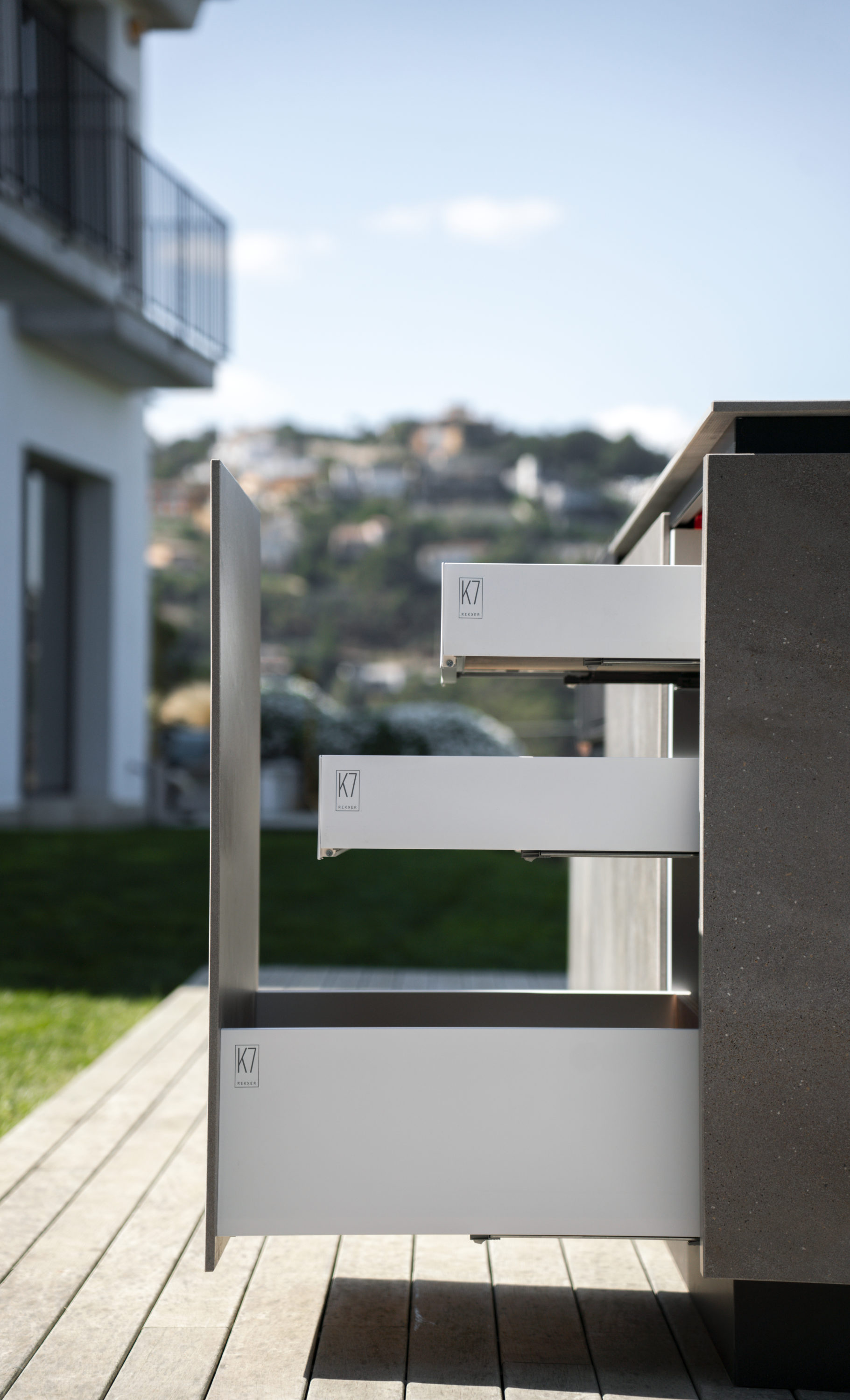 Una de les millors opcions per a cuines exteriors són els armaris metàl·lics, en el cas del model K7, els armaris estan fets d'alumini - un material reciclable, molt resistent a temperatures extremes, que ens permetrà instal·lar una cuina d'exterior amb totes les garanties.